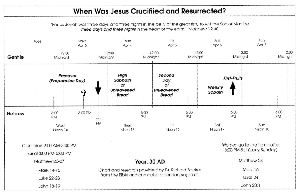 Would you like more information about the timing of Jesus’s Death and Resurrection? Dr. Richard Booker’s book Celebrating Jesus in the Biblical Feasts explains not only the timing of the death and resurrection, but also the significance of all the feasts and how Jesus is the fulfillment of them. I don’t get any kickbacks from promoting this. I just know it is excellent material. This is the primary source of the information in this article as well as the source of this image, which is amazingly helpful: