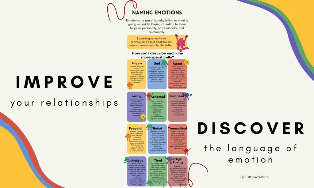 Trouble finding words to name feelings? Improve your relationship with your spouse with this free tool for naming emotions. Help your kids voice their feelings and improve their EQ.